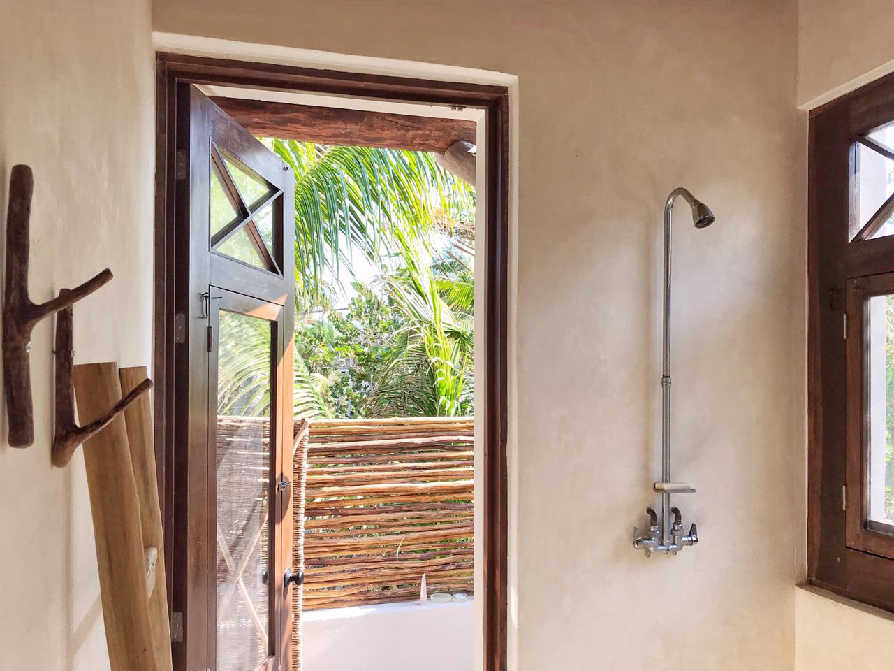 The house offers two bedrooms, one with queen size and one with king size bed. Both have ensuite bathrooms with hot showers and all amenities. The upstairs master bedroom further hosts a tropical outside shower. Both bedrooms have ACs and there are fans throughout the house.